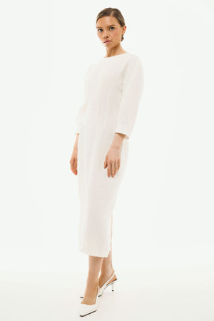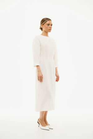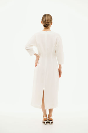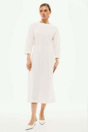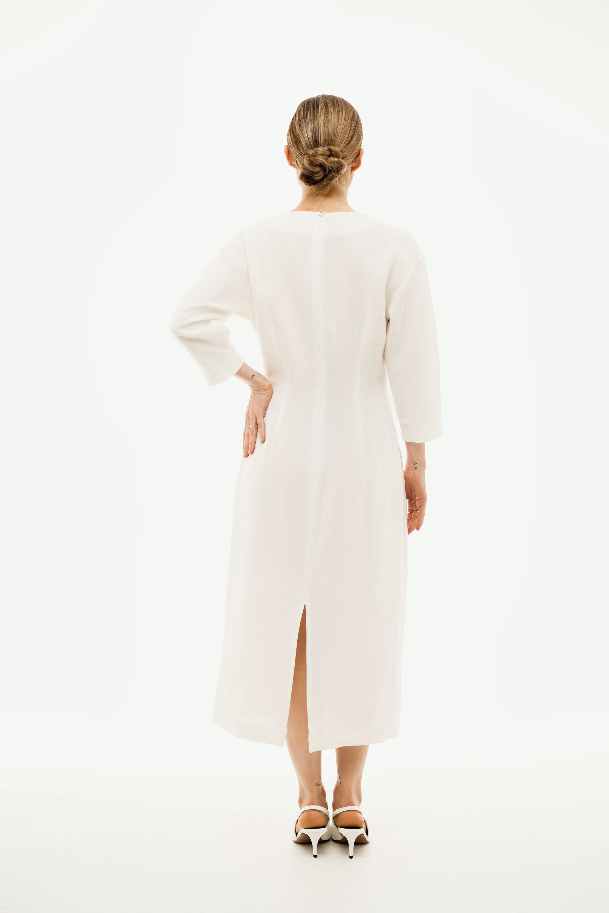 The Elena midi dress is a perfect fusion of classic elegance and modern design. Featuring a loose-fitting top with waist-highlighting gathers, it creates a flattering silhouette that moves effortlessly with you. The three-quarter length sleeves add a versatile touch, making it suitable for a variety of occasions. Made from 100% linen, the dress offers a soft, breathable feel for all-day comfort. Available in Off White and Powder Pink, it’s a timeless wardrobe staple with a contemporary twist.