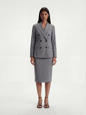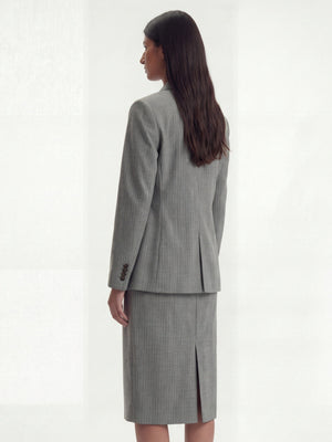 Available in two timeless tones—Platinum Grey and Sky Mist Blue with White Stripe—this blazer pairs seamlessly with our knee-length skirt or fitted midi dresses for a modern, cohesive look.