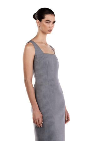 Olivia Tailored Midi Dress with Square Neck in Sky Mist Blue with White Stripe